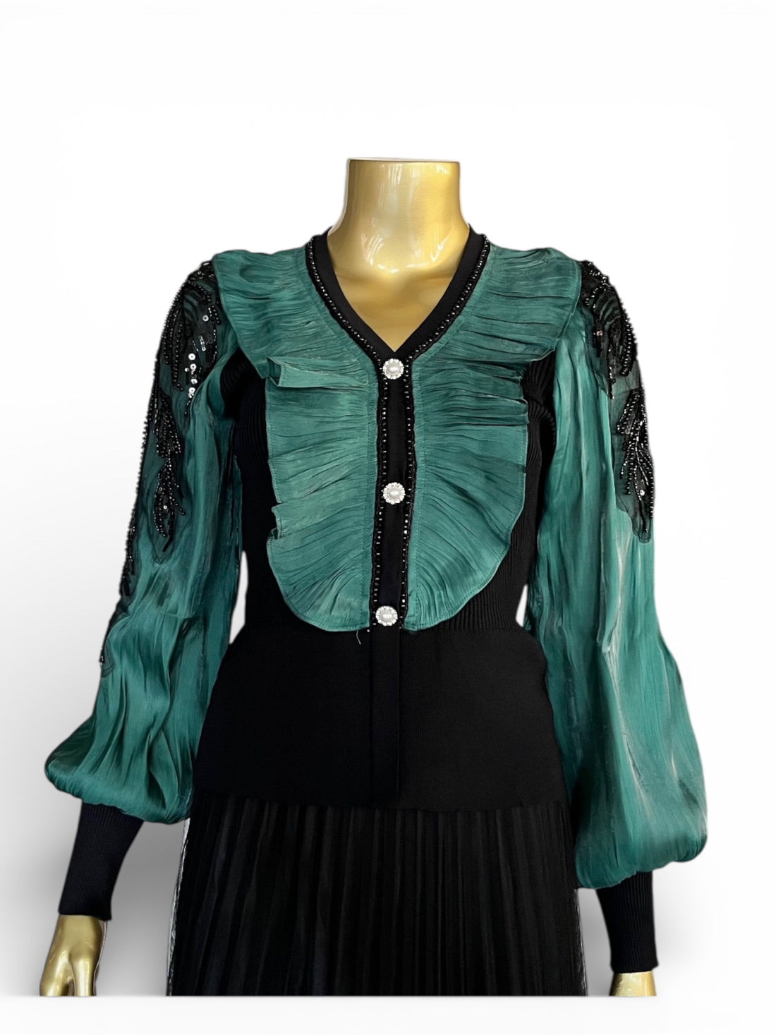 Kolları ve yakası şifon, kolları boncuk işlemeli triko bluz