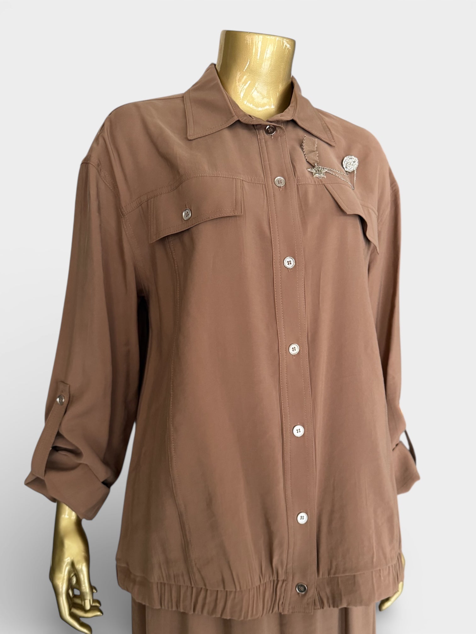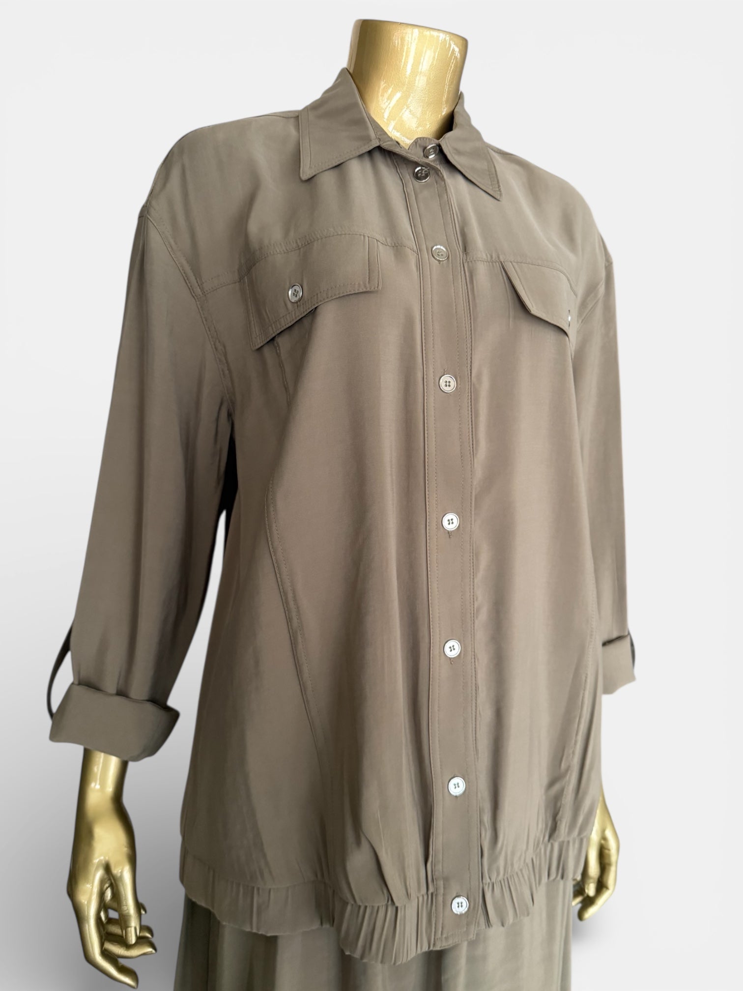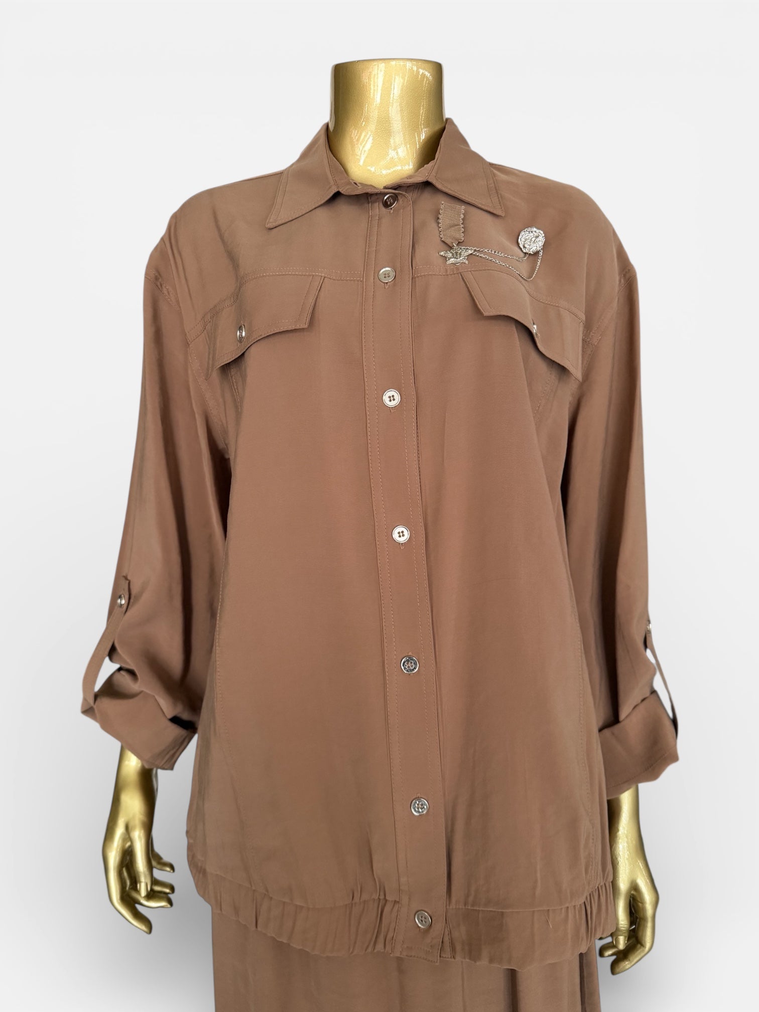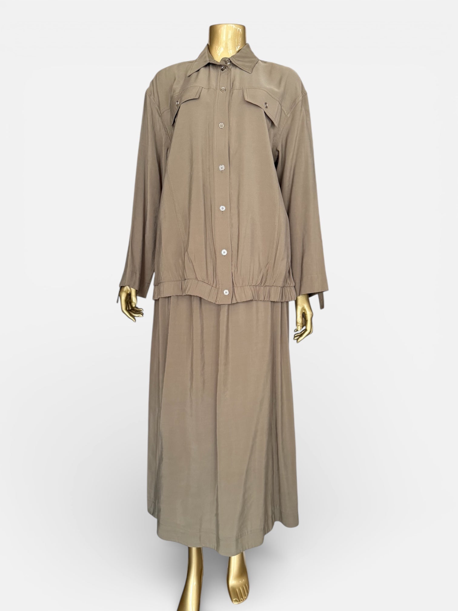 Yüksek kaliteli TENCEL kumaşından tasarlanan bu takım, modern kadının ihtiyaçlarını karşılamak üzere geliştirilmiştir. Bluz 69 cm boyunda kesilerek ideal bir orantı sunarken, 94 cm etek elastik bel sistemiyle gün içinde rahat hareket etmenizi sağlar. TENCEL lifinin biyolojik olarak parçalanabilir yapısı çevre dostu bir seçim sunmakla birlikte, kumaşın doğal parlaklığı ve yumuşak dokusu göz alıcı bir görünüm oluşturur. Nem düzenleyici özellikleri sayesinde her mevsimde konforlu giyilebilen bu takım, kaliteli malzeme ve dikkat çeken tasarımıyla uzun yıllar giyilebilir.